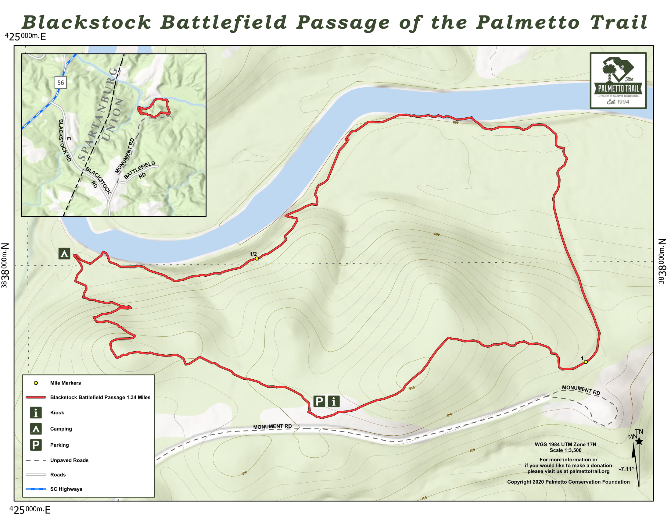 Blackstock Battlefield Passage offers 1.3 miles of nature trails along a remote section of the Tyger River where Revolutionary War patriots defeated the British. On November 20, 1780, patriot militia fighting under Gen. Thomas Sumter (aka, “The Carolina Gamecock”) prevailed over British regulars under Lt. Col. Banastre Tarleton. Two months later Tarleton lost the Battle of Cowpens and fled north with his remaining troops. Preservation of the 54-acre Blackstock battlefield and construction of the Palmetto Trail are a combined effort of the Palmetto Trail organization, the Spartanburg Greenway Alliance, and the Mary Black Foundation. International Paper Company donated the site.