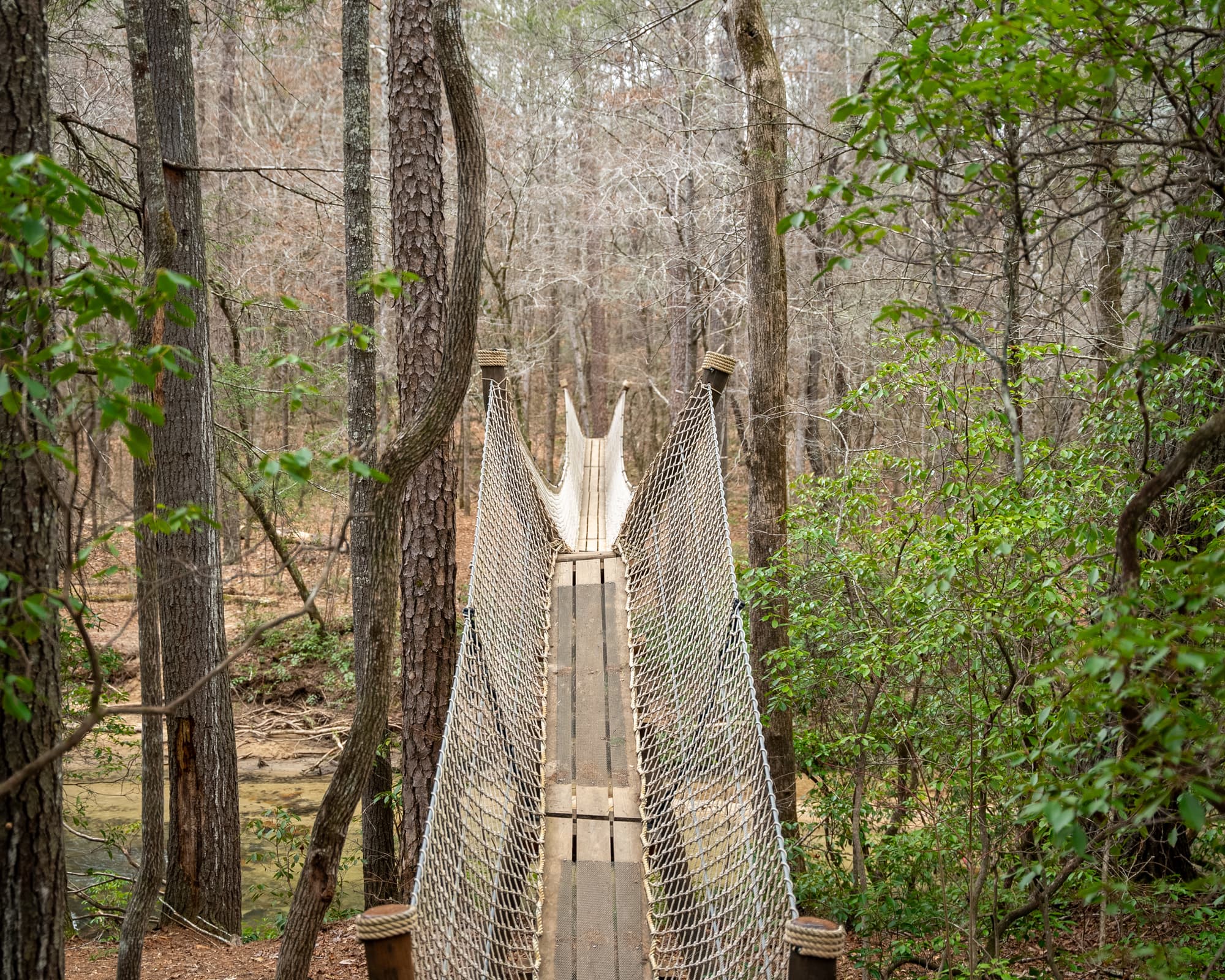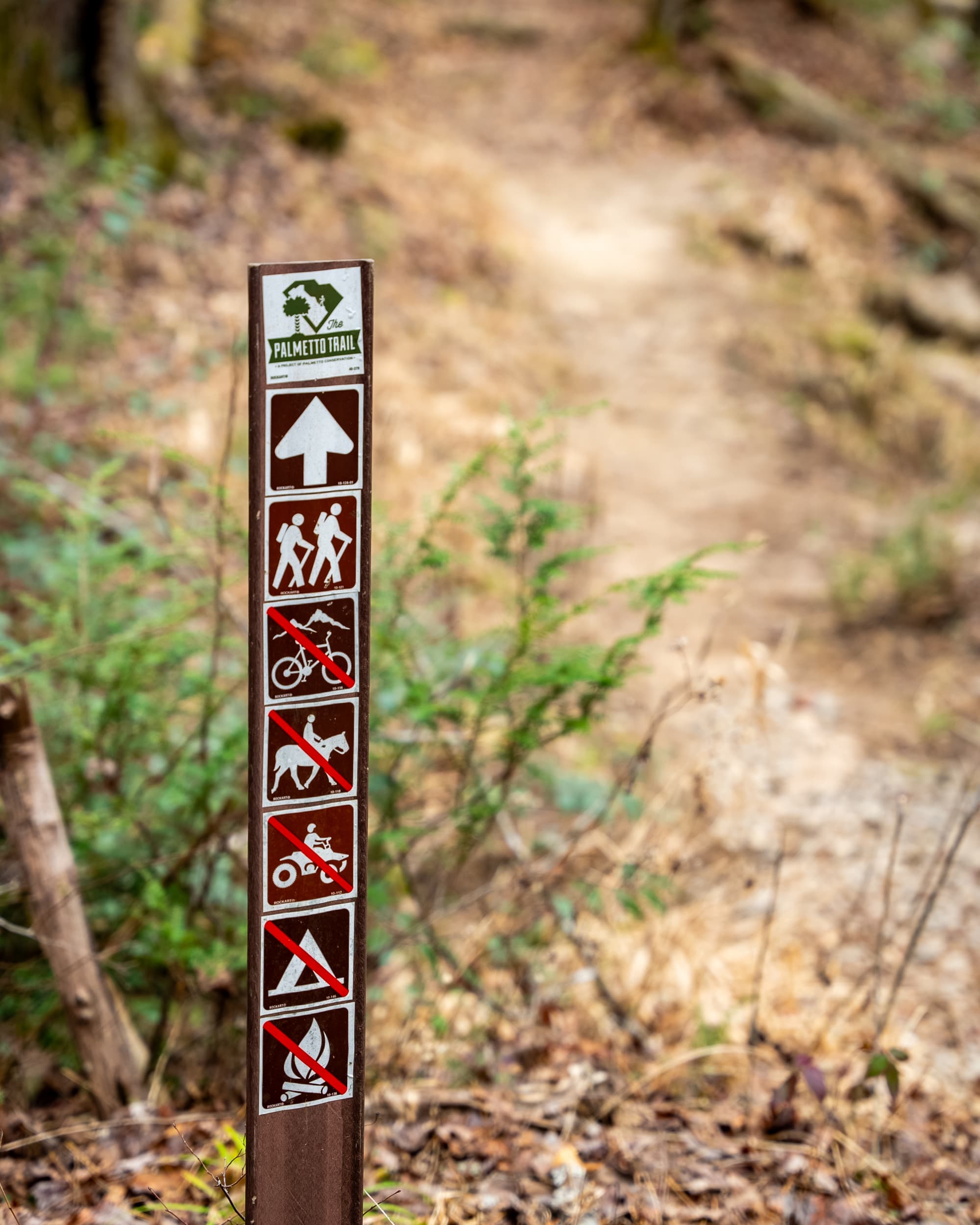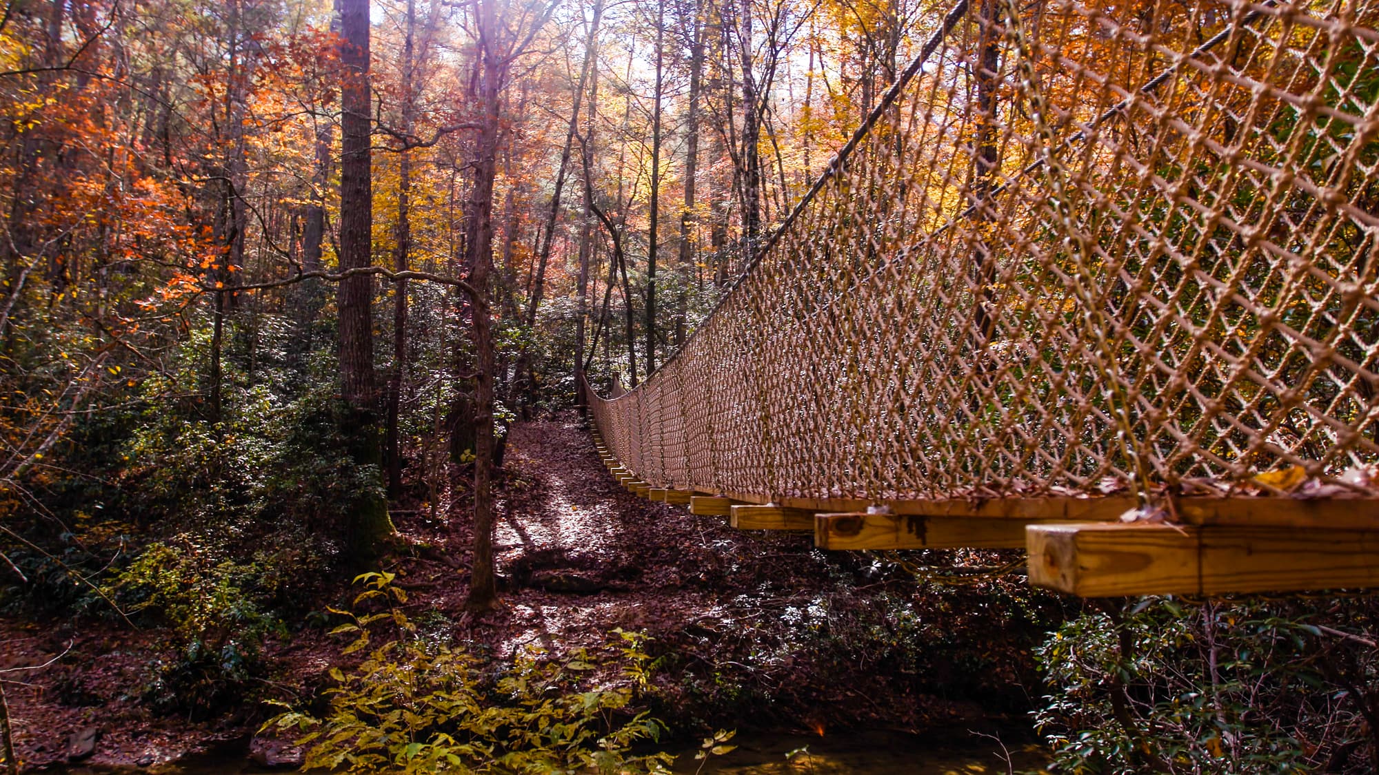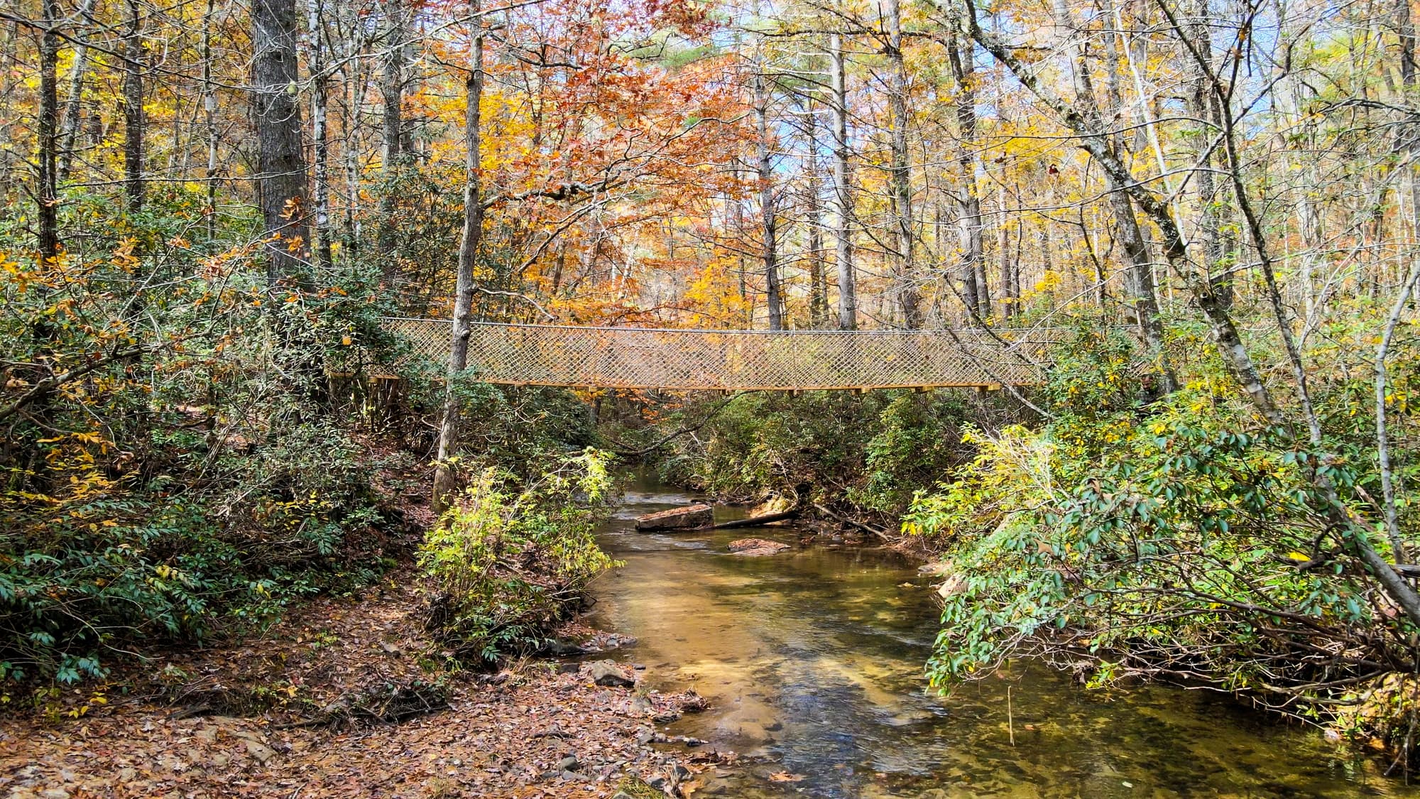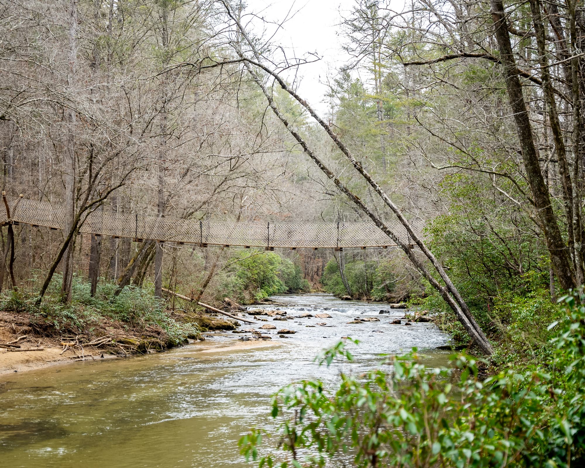 The Eastatoe Passage is part of the Jocassee Gorges Wilderness Area, described by National Geographic as a “destination of a lifetime.” The trail parallels Eastatoe Creek for some of its length, providing a delightful soundtrack to your hike. The Passage also includes a boardwalk above a waterfall on a small feeder creek. In addition to the creek, the trail traverses wooded mountain gorges with beautiful hardwoods and wildflowers. The distance from the SC SC Department of Natural Resources Dug Mountain Fishing Access parking lot to the first, 95-foot-long suspension bridge is only ¾ of a mile, and many come just to see the bridge. Access is via the Cherokee Foothills Scenic Highway, so even getting to the trailhead is a treat. This is a hiking-only passage. No motor vehicles, bicycles, or horses are allowed.