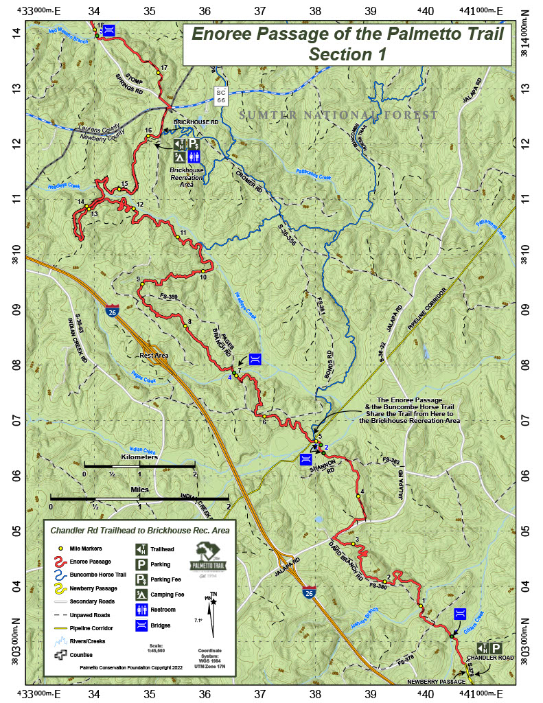 The Palmetto Trail shares the Buncombe Horse Trail for 10 miles, from the pipeline (mile 4.2) to Brick House Recreation Area.