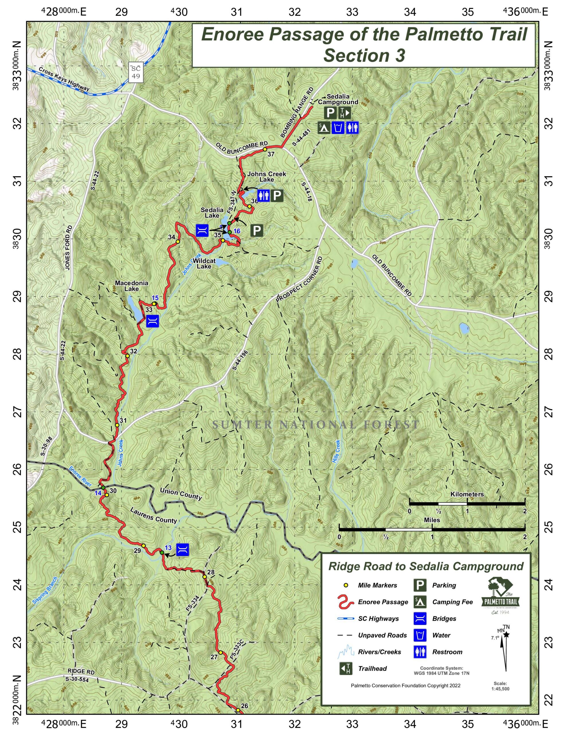 Buncombe trailhead for equestrians is located at Brick House Recreation Area (mile 14) and accessed from SC 66. There is access to the National Forest’s network of OHV (Off Highway Vehicle) trails between mile markers 18 and 20. Heading north, the Trail meanders through some of the most diverse habitats located in the Enoree Ranger District, including a beaver pond, numerous hardwood drains, and the Enoree River corridor. Take a break on the 80-foot bridge for superb views of the river, and stop to fish in Macedonia, Sedalia, and John’s Creek lakes on the way to the northern trailhead at Sedalia Campground.