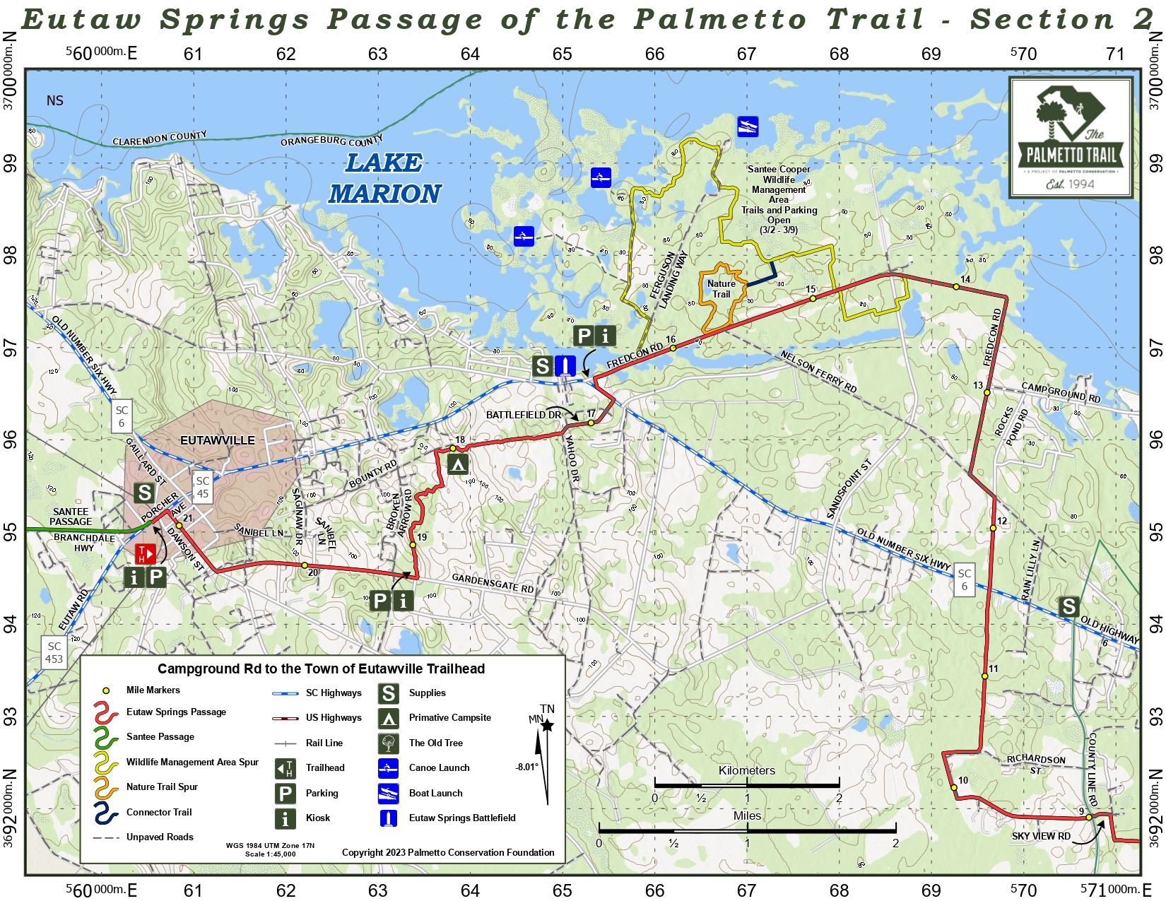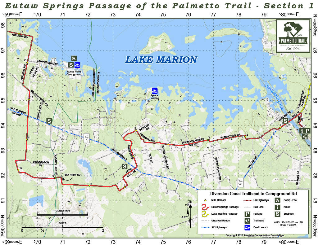 This Passage is one of many that highlights the role South Carolina played in the Revolutionary War. Watch for signage near mile marker 17 honoring the Battle of Eutaw Springs. This battle was the last major engagement of the war in the Carolinas–and interestingly, both sides claimed victory. A walk through pastures and shaded dirt roads brings you to the town of Eutawville, where shops can meet your resupply needs. A spur trail off Fredcon Road beginning near mile marker 14 meanders through Santee-Cooper Wildlife Management Refuge from low swampy areas to the southern edges of Lake Marion. If you take the full spur trail, it will add about five miles to the passage.