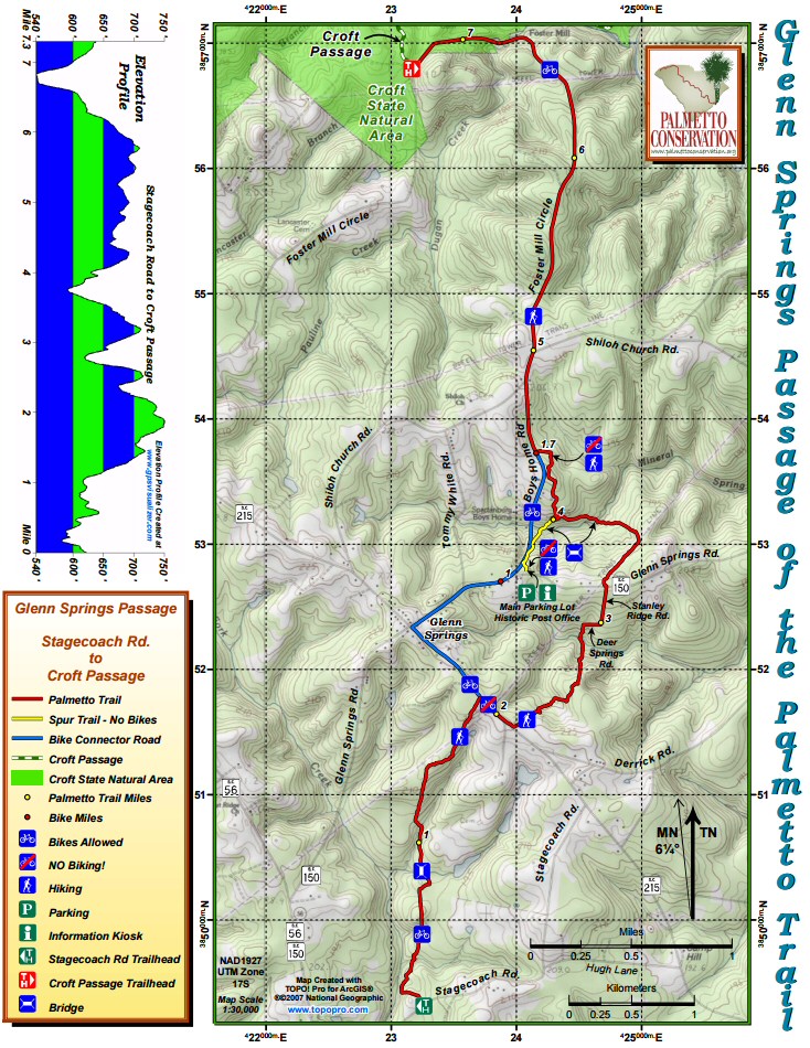 Rolling farmlands, mature forests, and the historic town of Glenn Springs highlight the Glenn Springs Passage. In the 19th century, Glenn Springs was known for the health benefits of its mineral waters. Now listed in the National Register, the historic district includes 20 historic buildings dating from about 1840 to 1940 and the site of a once-popular resort hotel. For most of this passage, local residents allow the Palmetto Trail to cross their farms and forests. Please respect their private property and stay on the Trail. Bikes are only allowed on a portion of the passage; please use the bike connector road to by-pass the portion of trail which does not accommodate bikes.