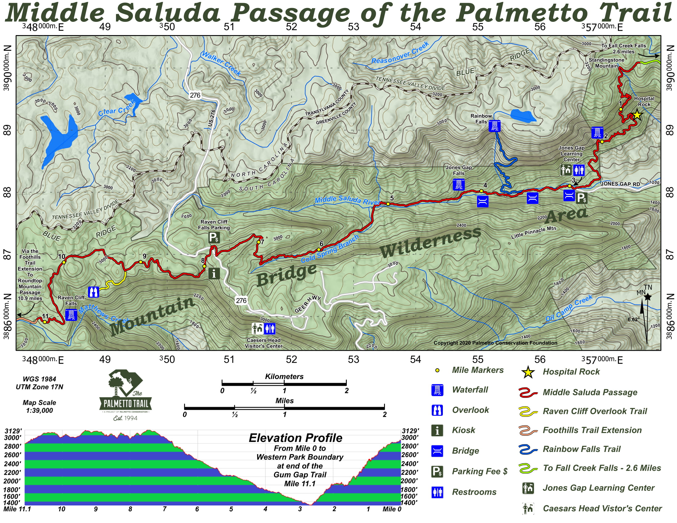 NOTICE: The Eastern section of the Middle Saluda Passage, which includes a section of the Hospital Rock Trail and the Falls Creek Falls Trail at Jones Gap is CLOSED TO ALL TRAIL USERS. These areas are NOT TO BE HIKED. The Palmetto Trail is in discussions with the park service to locate a more sustainable route for this trail that will provide a safe and enjoyable experience for all hikers. If you have any questions regarding the Palmetto Trail on this passage, please contact our Regional Trail Coordinator: Rob Achenberg at rachenberg@palmettoconservation.org