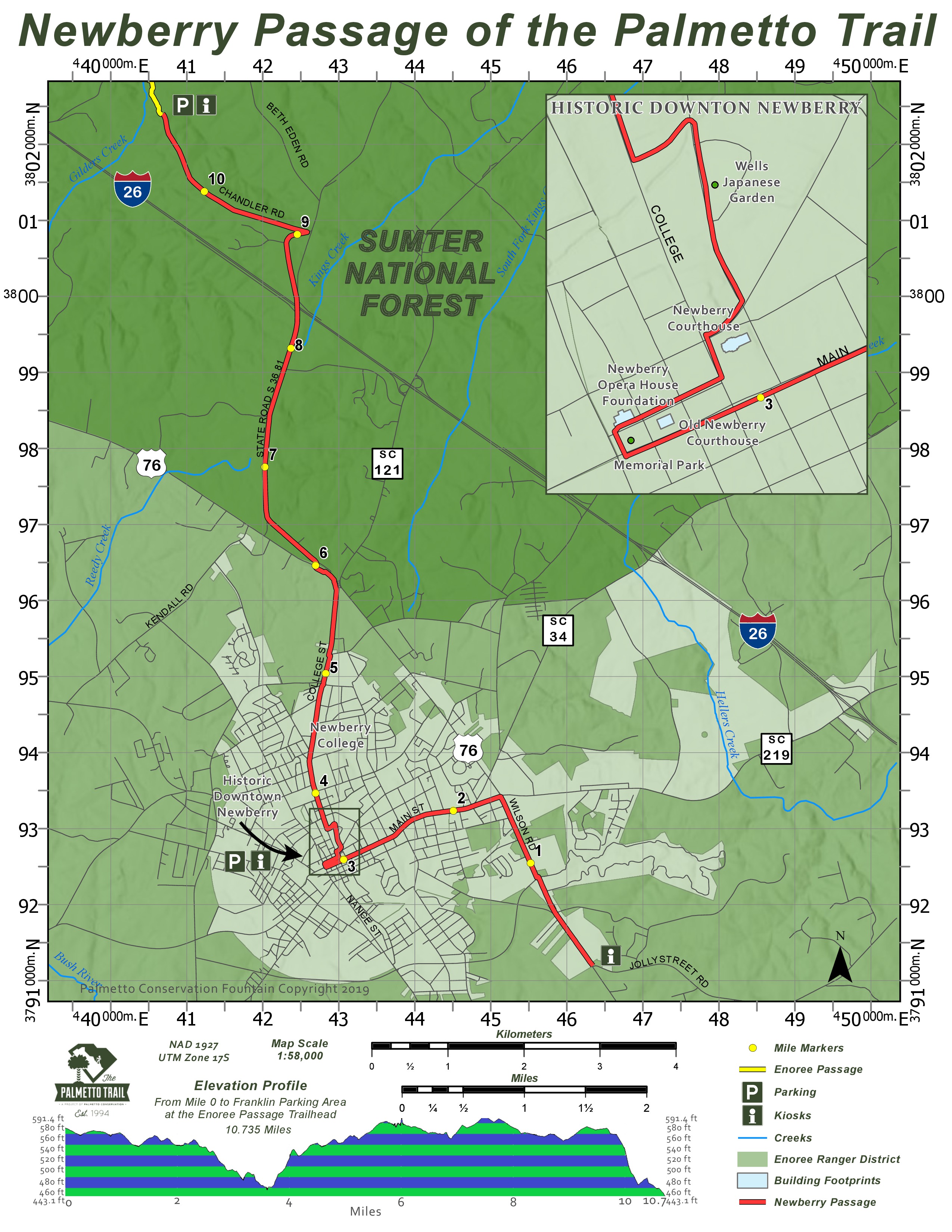 While most of the passages of the Palmetto Trail wander through the backwoods and countryside of our beautiful state, every now and then a passage takes you through one of those magical small towns filled with southern grace and hospitality. One of those is the Newberry Passage. Coming from the depths of the Sumter National Forest on the Enoree Passage, the Newberry Passage takes the visitor along shaded sidewalks passing antebellum homes; Newberry College, founded in 1856; a renovated Main Street with shops, cafes, bars and ice cream parlors; and several historic buildings such as the Old Court House and the Opera House. It even has a Japanese Garden tucked away on a side street, waiting to be discovered. Newberry is known as the “City of Friendly Folks” and it lives up to its name as everyone who visits is made to feel welcome. Outside the historic downtown district, the Passage takes the user near a bustling business area with franchise and local fast food and larger box stores where one can grab a quick meal or pick up supplies. There are also hotels and and B&Bs available should a hiker need a “zero day” to recharge. And as an added bonus, to transition from the urban environment, the nearby Newberry County Lynch’s Woods Park/Palmetto Trail Lynches Woods Passage offers a relaxing loop hike through a beautiful, wooded park connecting to the Newberry Passage. The Lynches Woods Trailhead is approximately 1000 feet from the Newberry Passage: on Walter Cousins Road. The Newberry Passage is a 10-mile section with approximately 4 miles inside the city limits.