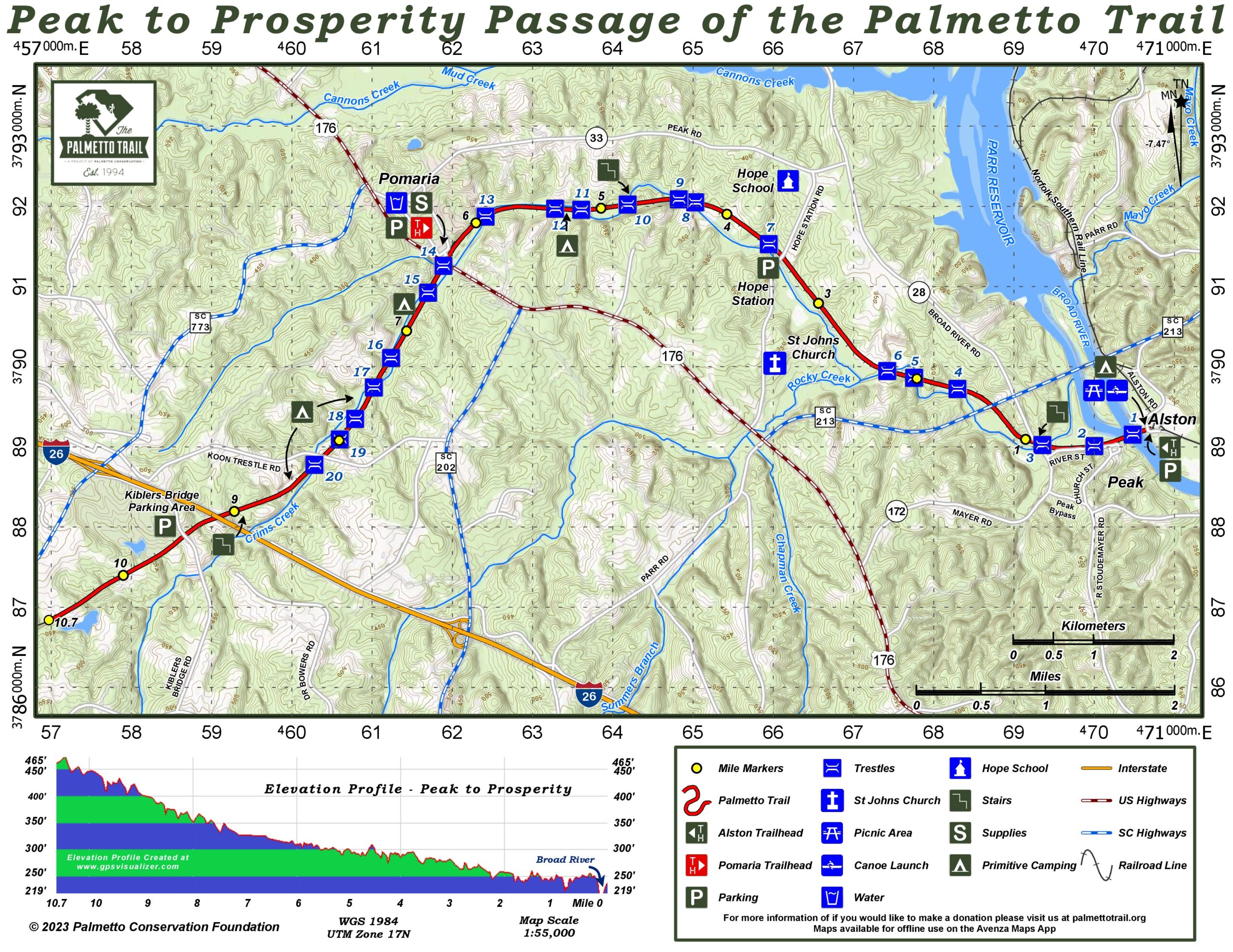 The 11-mile, 200-foot-wide right-of-way for the Passage was purchased from Norfolk Southern Railroad. Thanks to SC Parks, Recreation & Tourism for funds to convert the river trestle to a Passage treadway, and to Fairfield County for funds to develop the Alston trailhead park.